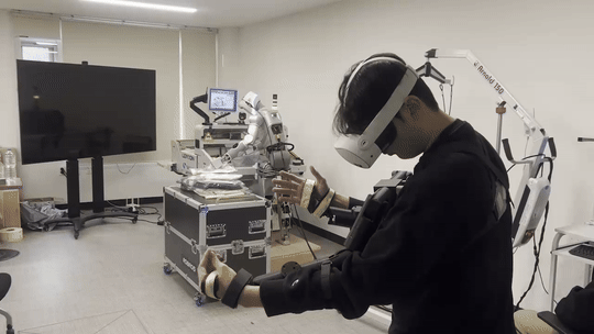 박 교수는 이를 보완하기 위해 VR 장치와 착용형 골격 장치를 결합했다. 그는 "관절 정보나 말단 장치 위치 제어 정보는 믿을 수 있는 골격 장치를 사용하고, 고개 정보는 정확하기 때문에 VR 정보를 활용한다"고 설명했다. 손가락 제어 역시 VR 정보를 활용해 고차원 손가락 커맨드를 제어하고 있다고 덧붙였다.