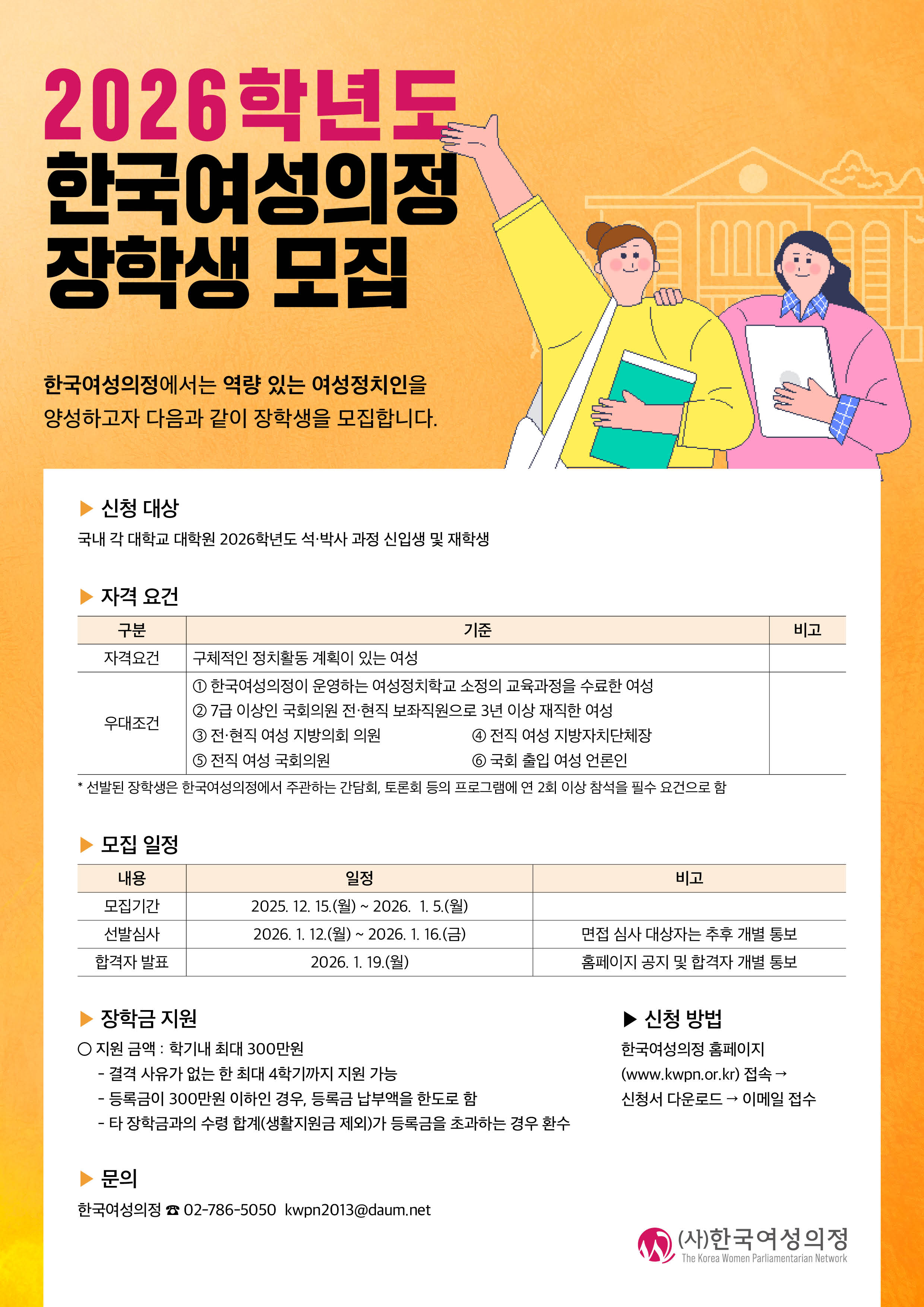 [장학] [한국여성의정] 2026년도 한국여성의정 장학생 모집